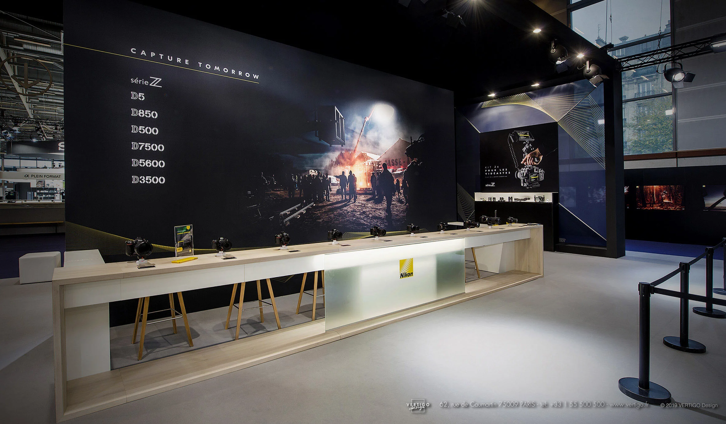 Pour l'édition 2019 du salon de la photo,une seule thématique attendue par la marque : le monde du cinéma et de la vidéo.Habillage de stand dans un univers backstage...